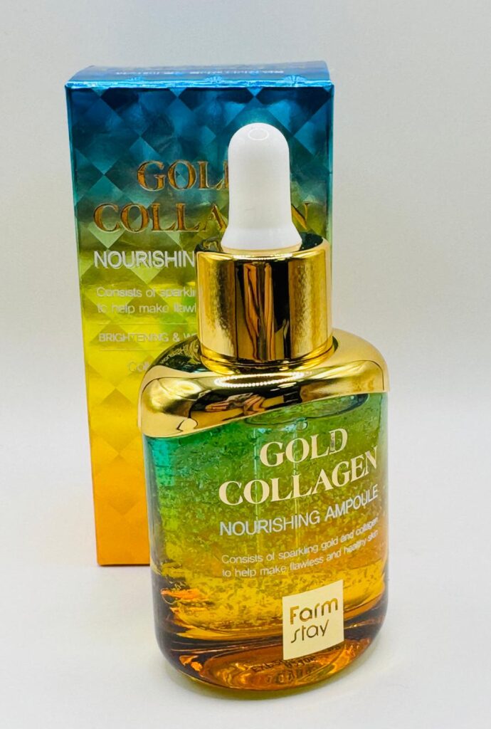 Farmstay Gold Collagen Nourishing Ampoule – tai intensyviai maitinantis, stangrinantis ir odą atgaivinantis serumas, sukurtas brandžiai, pavargusiai ar elastingumą praradusiai odai. Formulėje derinami hidrolizuotas kolagenas ir 24K aukso dalelės, kurios padeda pagerinti odos tonusą, suteikti švytėjimo ir sumažinti smulkių raukšlelių matomumą.